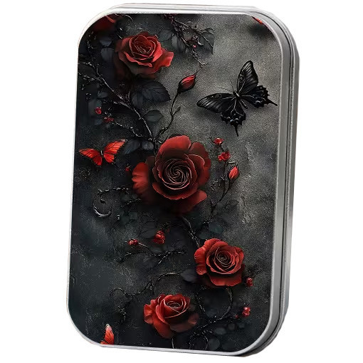 Petite boite en métal avec une illustration de roses et d'un papillon noir.