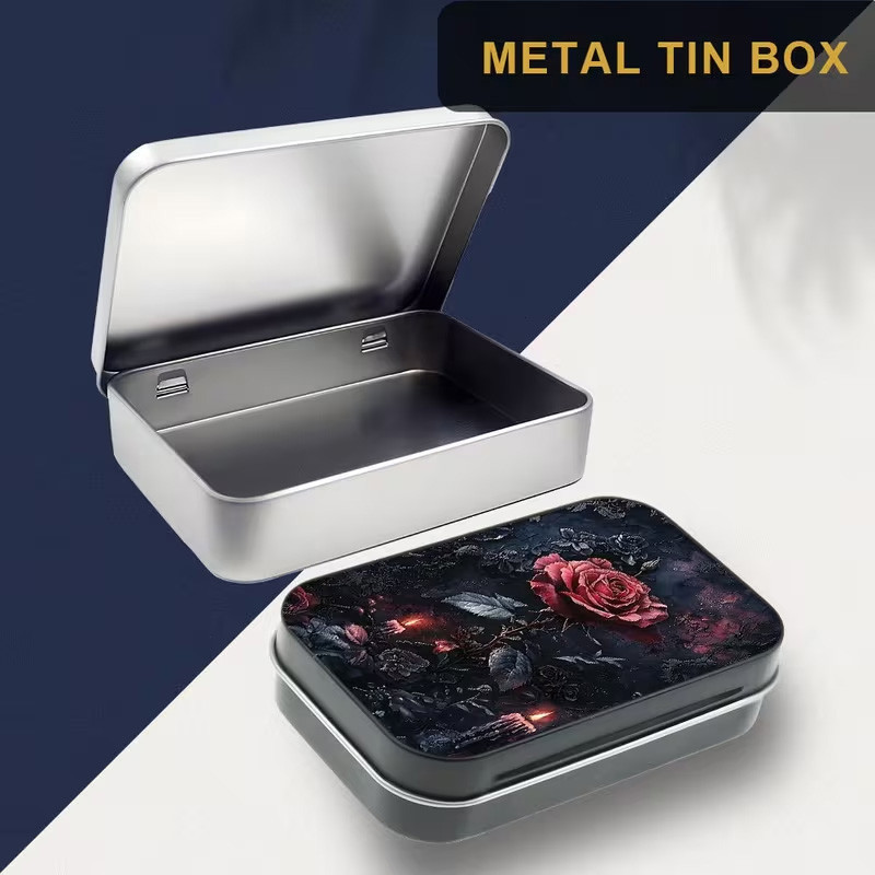 Petite boite en métal avec une illustration de rose rouge.