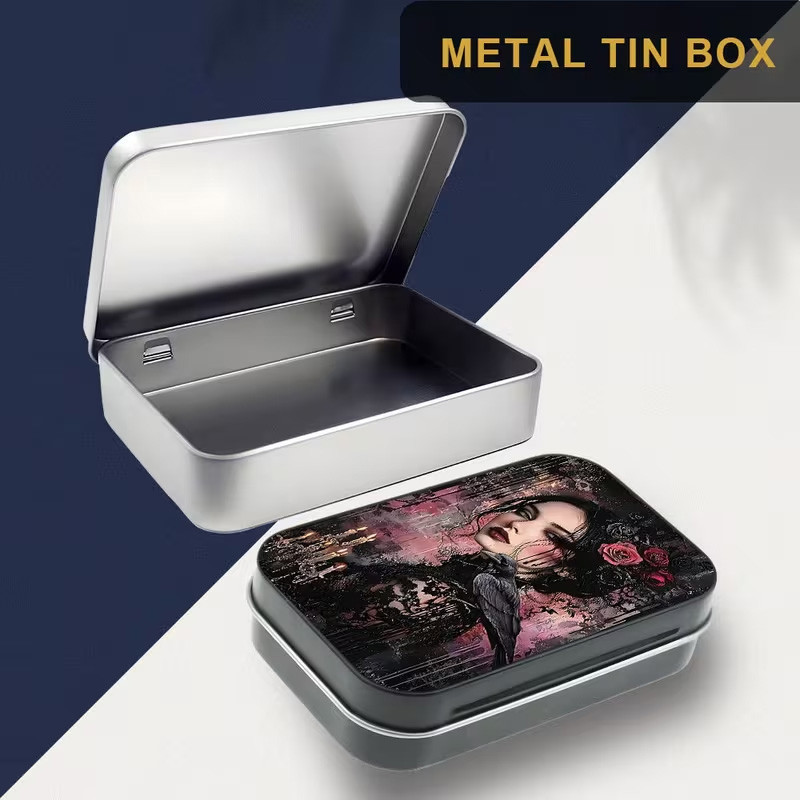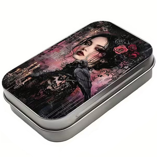 Petite boite en métal avec une illustration de femme gothique avec un corbeau.