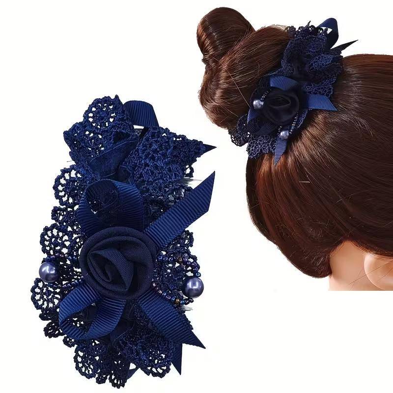 Chouchou gothique bleu orné de dentelle,de rubans, de perles et d'une rose.