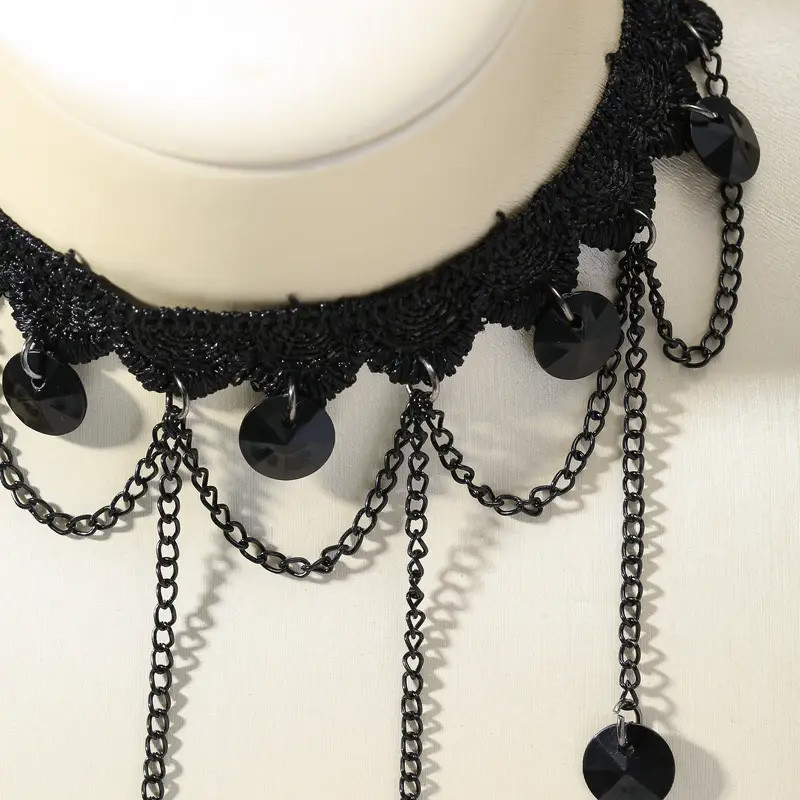 Collier Gothique en dentelle avec des chaînes et des charms noirs fantaisie.