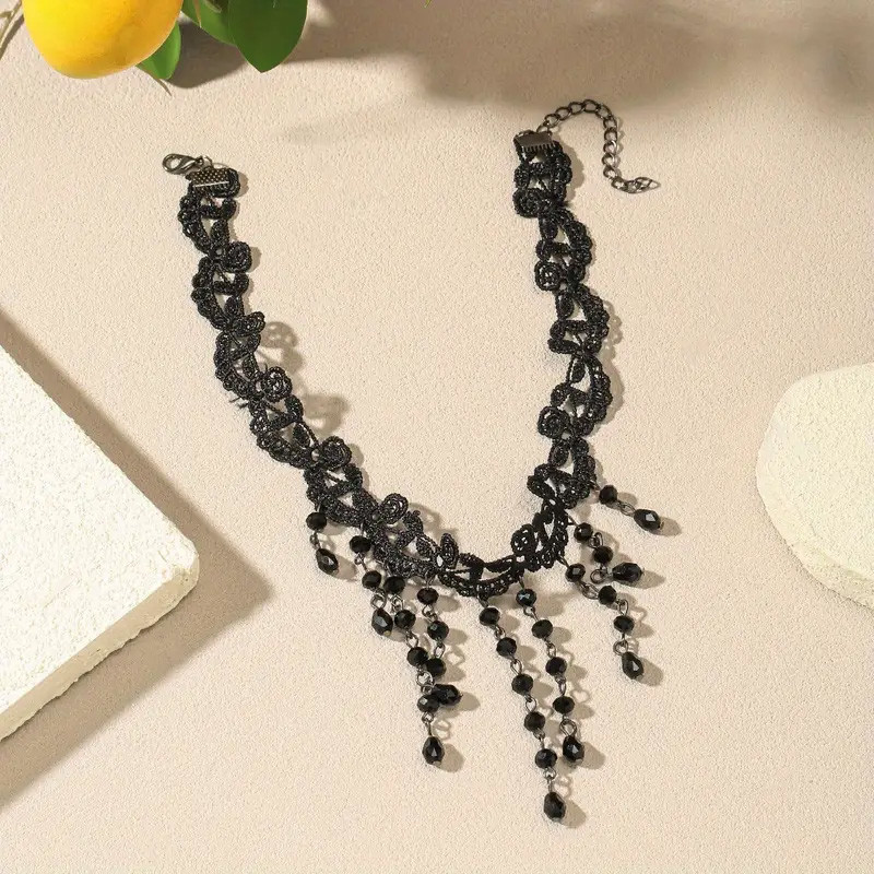 Collier Gothique en dentelle avec des perles noires fantaisie tombantes.