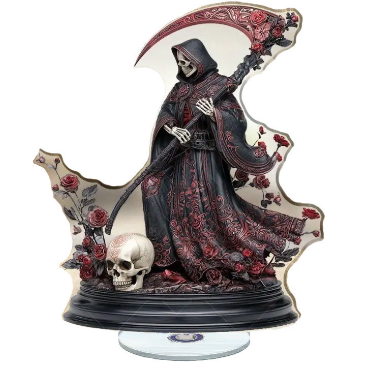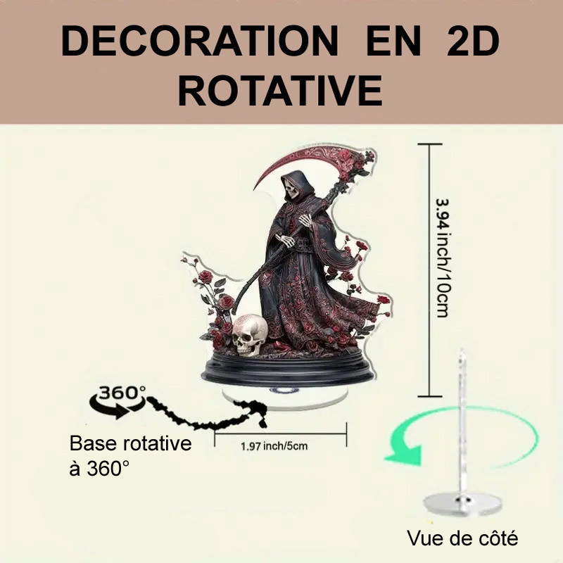 Petite décoration plate en acrylique avec une illustration représentant la Mort avec sa faux.