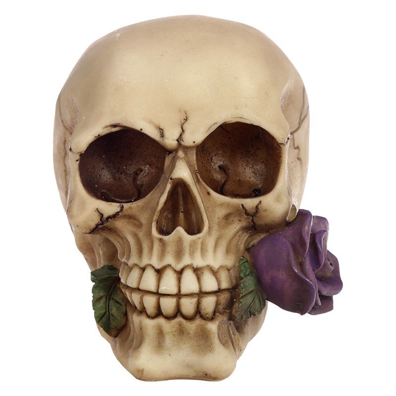 Figurine de Crâne avec une rose violette entre les dents.