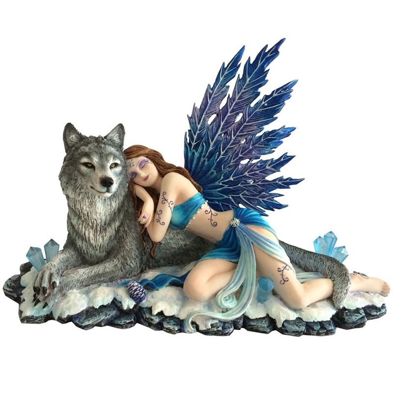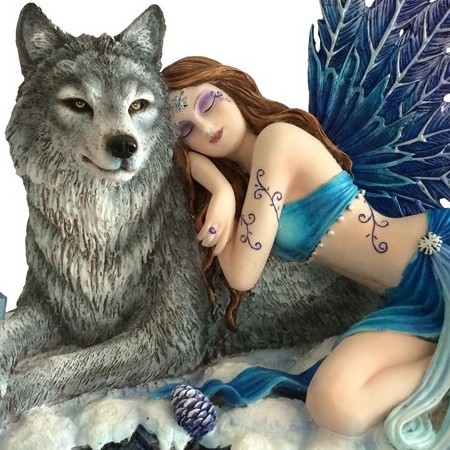 Figurine de Fée gothique géante endormie sur un magnifique grand loup gris.
