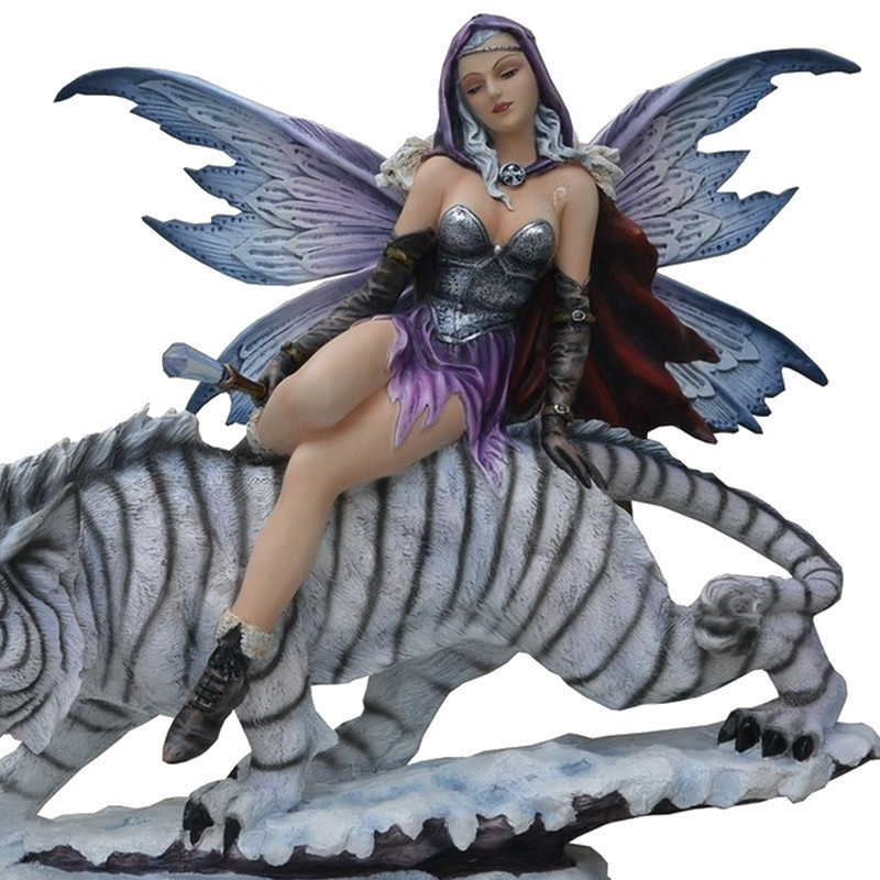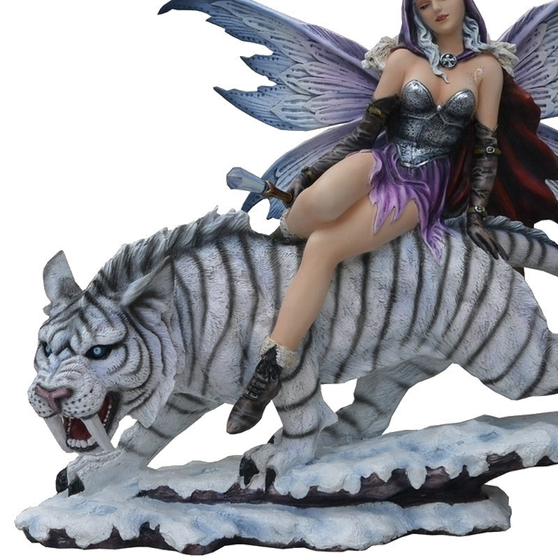 Figurine de Fée gothique guerrière géante assise sur un magnifique tigre blanc à dents de sabre.