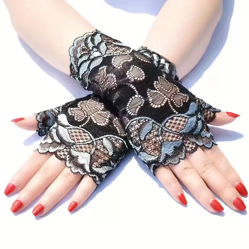 Paire de mitaines gothiques en dentelle noire et bleu ciel.