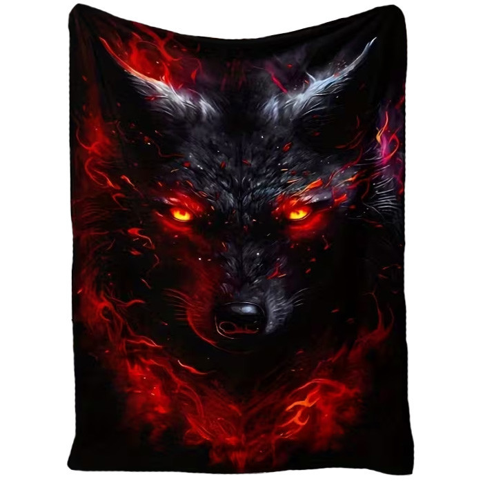 Plaid Gothique en flanelle souple 200-250g/㎡ avec une illustration sur le devant représentant un loup de l'enfer.