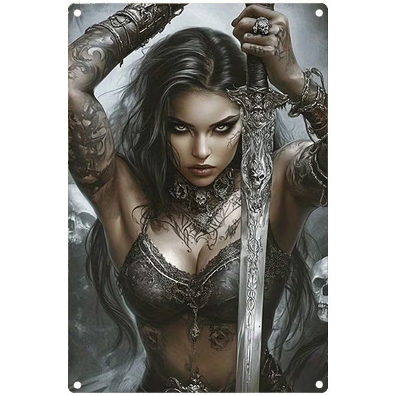 Plaque en métal Gothique avec une illustration représentant une magnifique guerrière.