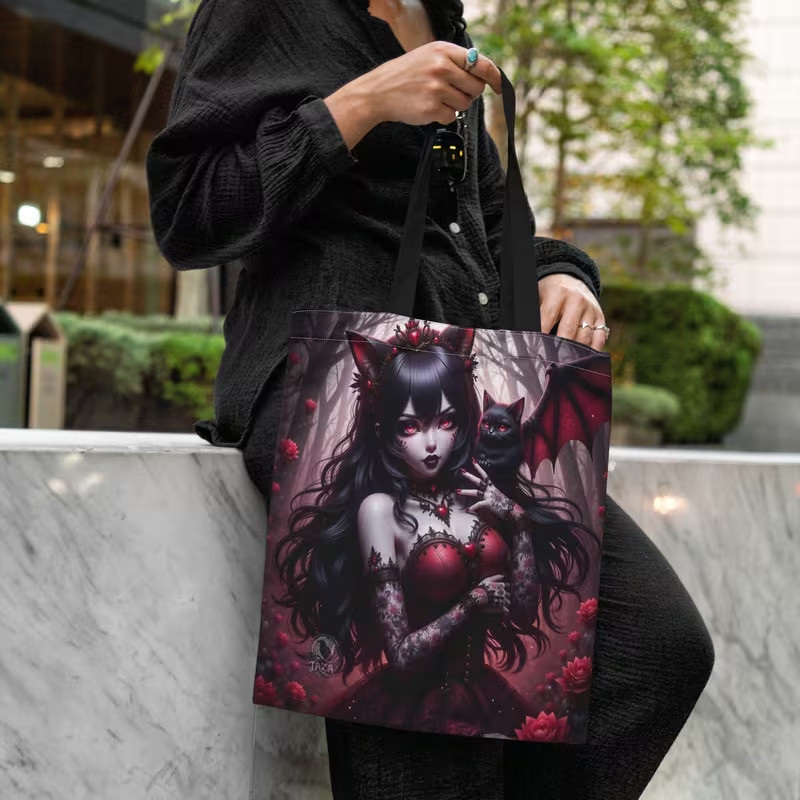 Sac gothique en toile pour le shopping ou tout autre usage, décoré intégralement sur les 2 faces avec une illustration de fille gothique.