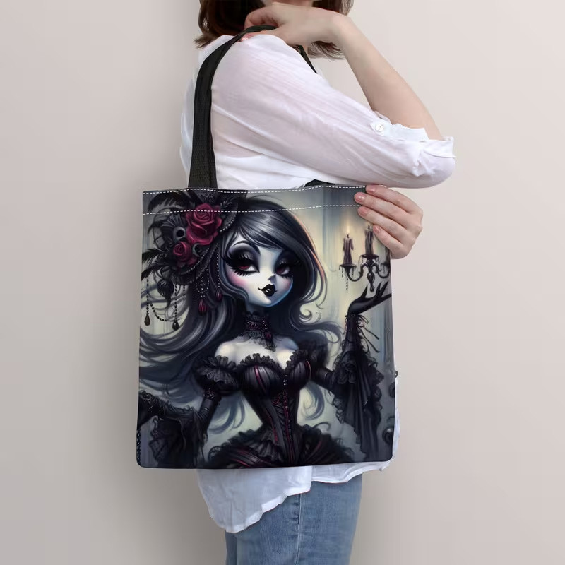 Sac gothique en toile pour le shopping ou tout autre usage, décoré intégralement sur les 2 faces avec une illustration de fille gothique.